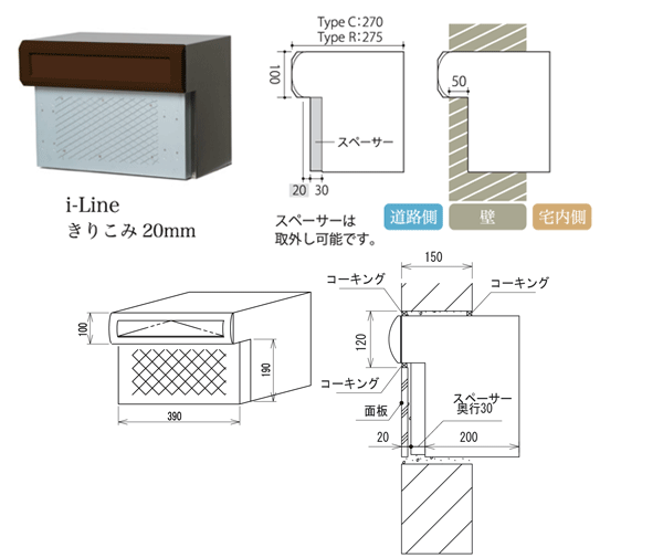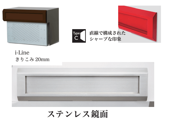 口金 郵便ポスト アイライン TypeC きりこみ20mm ステンレス鏡面 埋め込み